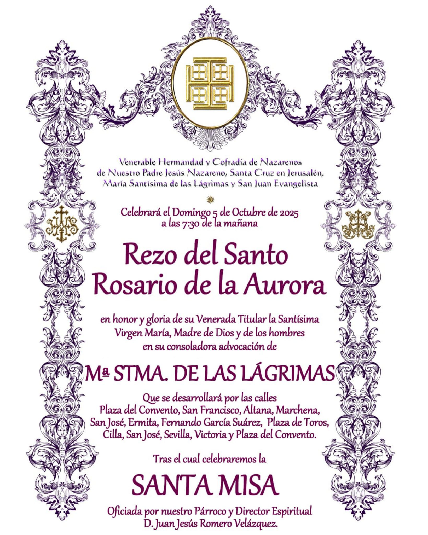 El próximo Domingo, 5 de Octubre, a las 7:30 horas de la mañana, siguiendo nuestras reglas, celebraremos el Rosario de la Aurora en honor a Nuestra Amantísima Titular María Santísima de las Lágrimas, tras el cual celebraremos Solemne Eucaristía oficiada por nuestro párroco y director espiritual Don Juan Jesús Romero Velázquez.